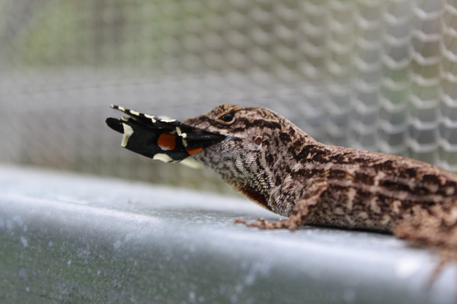 After the talk from Bill Mitsh, we drove to the Naples Botanical Garden where we were told we could explore until a designated time, several people went round recording all the species native and not for their species list. I myself took a more leisurely approach and wondered round just observing what I could see. Finding myself in the butterfly house I found that all the species within were native so I attempted to photograph these for my own list. On leaving the butterfly house I noticed a Cuban Anole on a metal support on closer inspection I saw it was in the process of eating a butterfly I took a photo of this behaviour.